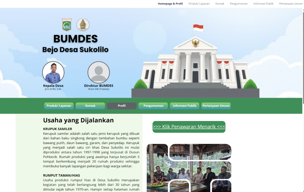 Website BUMDes yang dikembangkan dirancang sebagai pusat informasi dan promosi potensi ekonomi desa, yang memuat profil kelembagaan, unit usaha, produk unggulan, layanan masyarakat, serta dokumentasi kegiatan. Kehadiran platform digital ini diharapkan mampu meningkatkan keterbukaan informasi, memperluas jangkauan pemasaran, dan memperkuat daya saing BUMDes di tengah dinamika ekonomi digital.