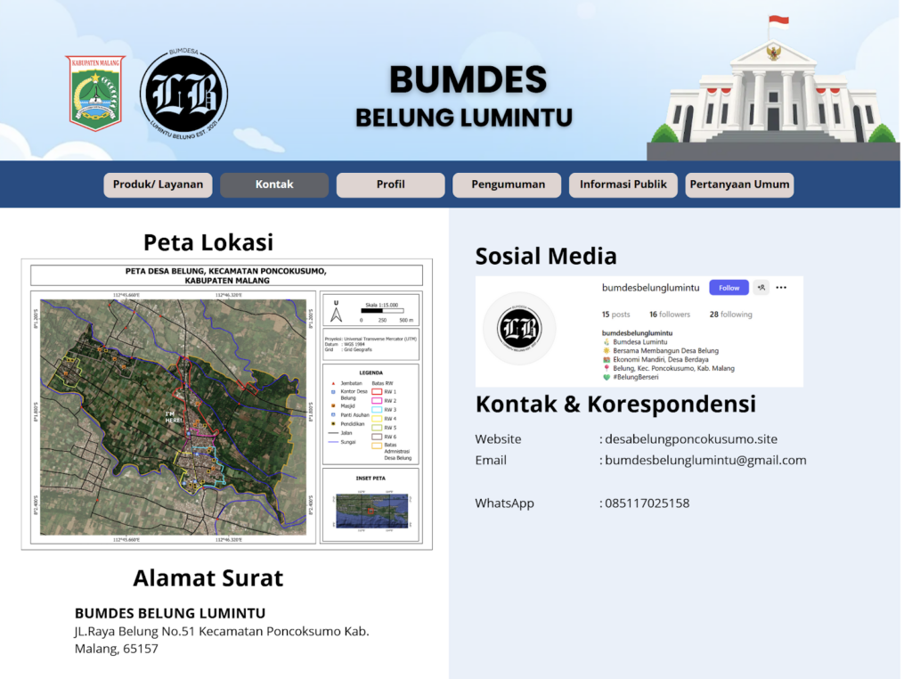 Website BUMDes Desa Belung dikembangkan sebagai media digital yang berfungsi untuk menyajikan informasi kelembagaan dan aktivitas usaha desa secara terbuka dan terstruktur. Melalui platform ini, masyarakat dapat mengakses profil BUMDes, jenis unit usaha yang dijalankan, informasi produk dan layanan, serta berbagai kegiatan yang dilaksanakan oleh BUMDes Desa Belung.
