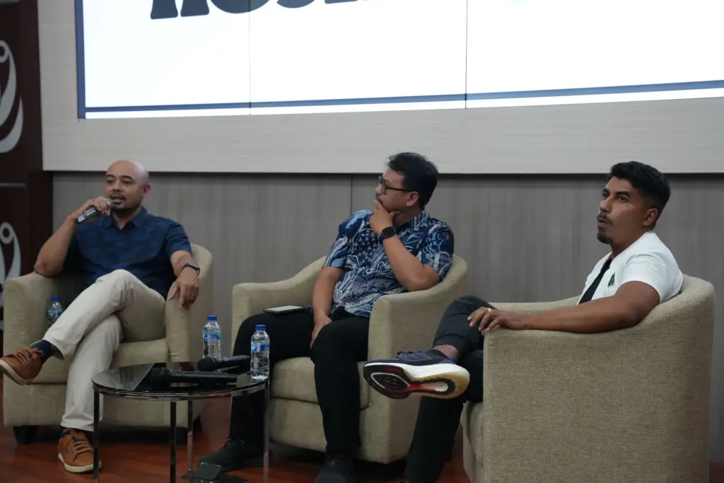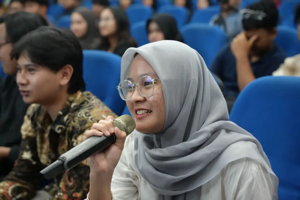 Pada sesi tanya jawab, mahasiswa menyorot cara validasi produk awal, memilih kanal prioritas, dan mengaitkan metrik digital dengan penjualan. Kedua narasumber mendorong pola mulai kecil → uji → ukur → ulangi agar pertumbuhan terukur.