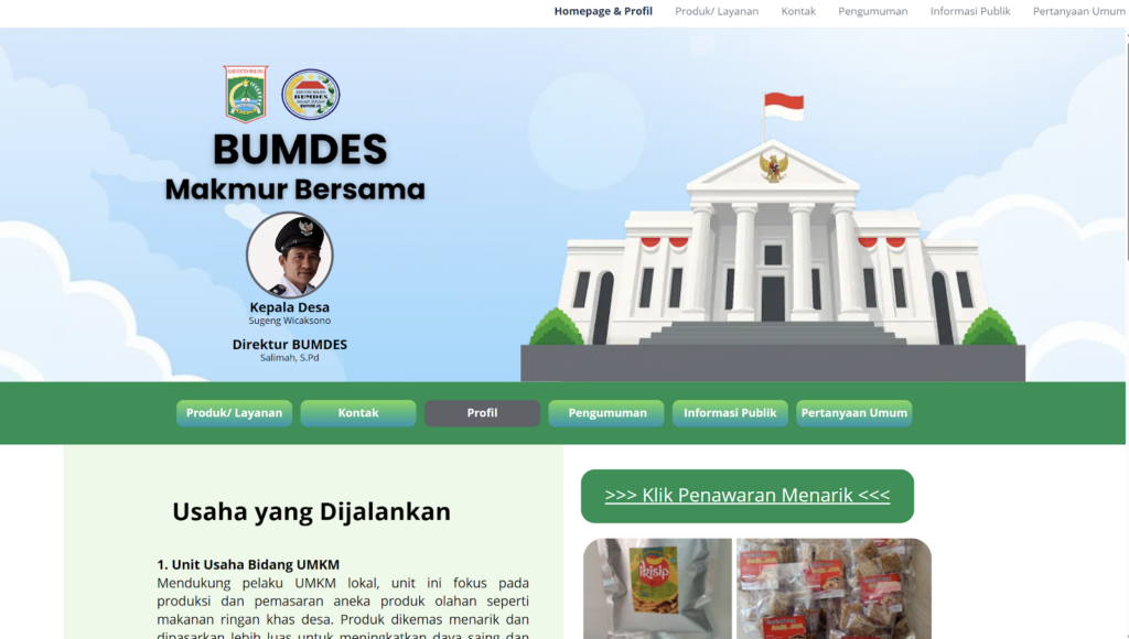 Website BUMDes Desa Bumirejo dikembangkan sebagai sarana penyampaian informasi mengenai profil kelembagaan, unit usaha yang dikelola, serta berbagai layanan ekonomi desa. Kehadiran platform digital ini diharapkan mampu meningkatkan visibilitas BUMDes sekaligus mempermudah masyarakat dalam mengakses informasi terkait aktivitas usaha desa.