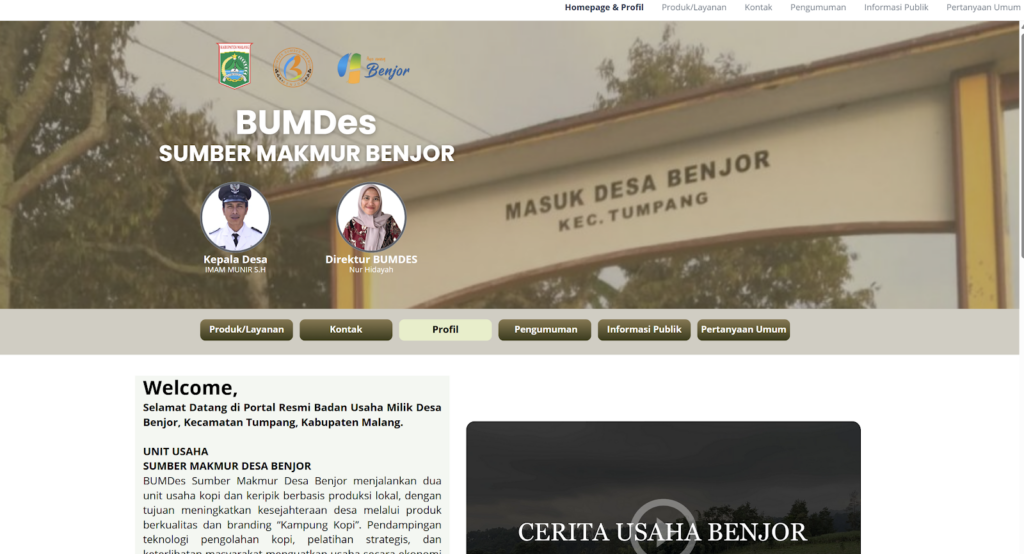 Website BUMDes Desa Benjor dikembangkan sebagai sarana integrasi informasi usaha desa, yang mencakup profil kelembagaan, struktur pengelola, unit usaha, serta dokumentasi kegiatan operasional BUMDes. Platform ini dirancang untuk membantu pengurus BUMDes dalam menyampaikan informasi secara terbuka kepada masyarakat, sekaligus mendukung praktik akuntabilitas dan transparansi pengelolaan usaha desa.