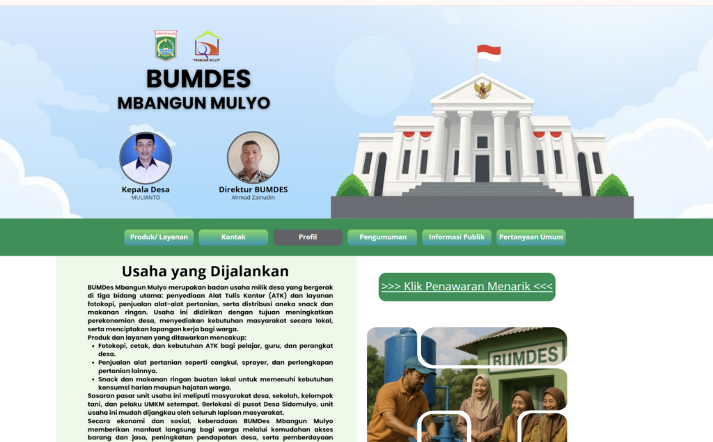 Website BUMDes Desa Sidomulyo dikembangkan sebagai media resmi yang memuat informasi kelembagaan, arah pengembangan usaha, serta layanan yang disediakan BUMDes. Keberadaan website ini diharapkan dapat membangun citra BUMDes sebagai lembaga ekonomi desa yang profesional dan terbuka terhadap masyarakat maupun mitra kerja.