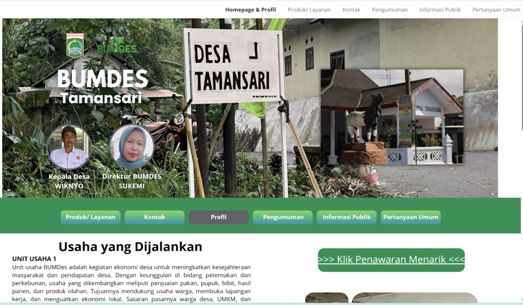 Website BUMDes Desa Taman Sari dirancang sebagai pusat informasi digital yang memuat data kelembagaan, jenis unit usaha, serta berbagai layanan ekonomi yang dikelola BUMDes. Kehadiran website ini diharapkan mampu memperluas jangkauan informasi, baik bagi masyarakat desa maupun pihak eksternal yang ingin mengetahui potensi ekonomi Desa Taman Sari.