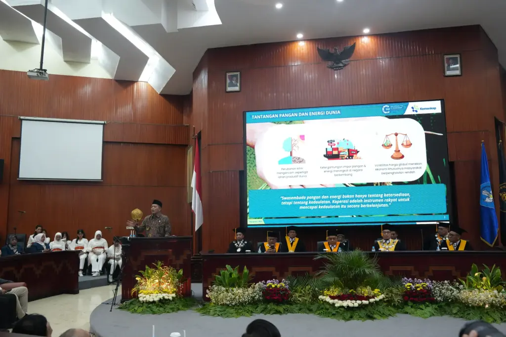 Puncak acara diisi orasi ilmiah dari Menteri Koperasi bertema “Membangun Kedaulatan Pangan dan Energi Melalui Koperasi.” Beliau memetakan tantangan global di sektor pangan dan energi, lalu memaparkan pelaksanaan program Asta Cita sebagai kerangka solusi. Dengan analogi yang membumi, ia menegaskan daya kolektif gerakan koperasi: “Koperasi adalah alatnya orang yang lemah, alatnya bangsa yang lemah. Seperti lidi—satu lidi itu lemah; tetapi ketika puluhan, ratusan lidi disatukan, ia menjadi alat yang membantu kita. Inilah konsep koperasi: dari ekonomi yang lemah menjadi ekonomi yang kuat.” Ia menambahkan, “Penguatan koperasi bukan sekadar program strategis nasional, tetapi gerakan negara. Jika kita saling menguatkan dan tolong-menolong, kita punya kesempatan besar mengembalikan arah ekonomi.” Menutup orasi, beliau menegaskan, “Saya mendukung pengembalian mata kuliah koperasi, dan dengan sangat terbuka UB menjadi mitra strategis Koperasi Indonesia.”