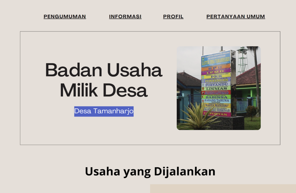 Website BUMDes Desa Taman Harjo dirancang sebagai media digital yang mendukung kebutuhan pengelolaan informasi usaha desa. Melalui website ini, BUMDes dapat menyajikan informasi kelembagaan, unit usaha yang dikelola, serta berbagai aktivitas usaha desa yang dapat diakses oleh masyarakat secara terbuka.
